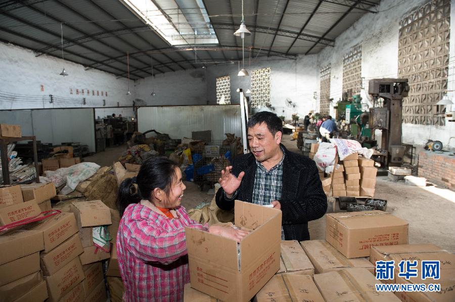 1月12日,刘明勇(右)在村里一家企业内和务工的村民交流了解他们对企业和村里工作的意见和建议。刘明勇是重庆市巴南区鱼洞金竹村远近闻名的老板,靠着搞个体运输发家致富,一年赚个一百万元是很轻松的事。可就在他生意做得风生水起的时候,村里的老书记找到他,让他回村里主持工作。 1963年,刘明勇就在这个村子出生,长大。在外漂泊了15年,当他再次回去时,家乡似乎还是那个样子,破旧的房屋,泥泞的街道,古老的水井。刘明勇看在眼里,急在心里。2007年底,刘明勇接受了金竹村当时的老书记朱本权的邀请回到家乡,被村民选为村书记。 “当了村主任,就要把担子挑起来。”刘明勇下定决心,用5年时间改变全村人的生活状况。 新华社记者 刘潺 摄
