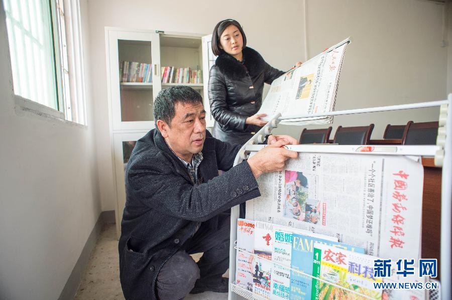 1月12日,村支书刘明勇(左)和村主任李凤(右)为金竹村五保户之家活动室更换报纸。刘明勇是重庆市巴南区鱼洞金竹村远近闻名的老板,靠着搞个体运输发家致富,一年赚个一百万元是很轻松的事。可就在他生意做得风生水起的时候,村里的老书记找到他,让他回村里主持工作。 1963年,刘明勇就在这个村子出生,长大。在外漂泊了15年,当他再次回去时,家乡似乎还是那个样子,破旧的房屋,泥泞的街道,古老的水井。刘明勇看在眼里,急在心里。2007年底,刘明勇接受了金竹村当时的老书记朱本权的邀请回到家乡,被村民选为村书记。 “当了村主任,就要把担子挑起来。”刘明勇下定决心,用5年时间改变全村人的生活状况。 新华社记者 刘潺 摄