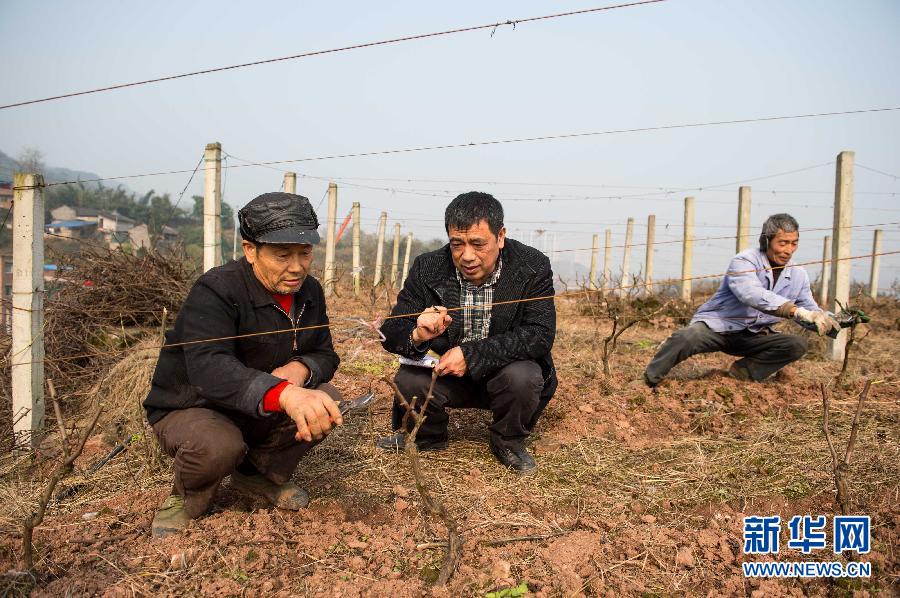 1月12日,刘明勇(右)在村里集体产业的葡萄园里和负责管护的村民进行交流。刘明勇是重庆市巴南区鱼洞金竹村远近闻名的老板,靠着搞个体运输发家致富,一年赚个一百万元是很轻松的事。可就在他生意做得风生水起的时候,村里的老书记找到他,让他回村里主持工作。 1963年,刘明勇就在这个村子出生,长大。在外漂泊了15年,当他再次回去时,家乡似乎还是那个样子,破旧的房屋,泥泞的街道,古老的水井。刘明勇看在眼里,急在心里。2007年底,刘明勇接受了金竹村当时的老书记朱本权的邀请回到家乡,被村民选为村书记。 “当了村主任,就要把担子挑起来。”刘明勇下定决心,用5年时间改变全村人的生活状况。 新华社记者 刘潺 摄
