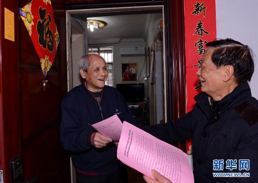 1月14日,黄以孟老人(右)将打印好的十八届中央纪委五次全会学习材料送到社区居民家中。当日,在福建省福州市仓山区对湖街道师大社区,84岁的退休老教师、社区义务宣传员黄以孟来到他设在社区里的“工作室”,整理十八届中央纪委五次全会学习材料,及时向社区居民宣传中央反腐倡廉建设的最新精神。新华社记者 张国俊 摄