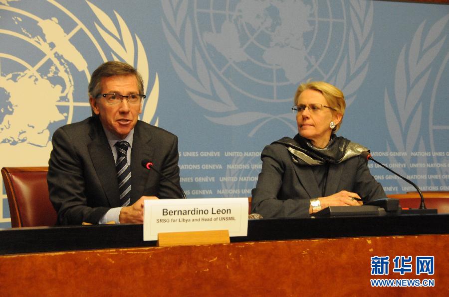 1月14日,在瑞士日内瓦万国宫,联合国秘书长利比亚问题特别代表、联利支助团负责人贝尔纳迪诺·莱昂(左)出席新一轮利比亚政治对话前举行的记者会。在联合国利比亚支助特派团(联利支助团)斡旋和主持下,来自利比亚国民代表大会、部分武装团体、经济领域以及公民社会的多方代表14日下午在联合国日内瓦办事处所在地万国宫举行新一轮政治对话,力图通过政治进程寻求解决利比亚日益严重的政治和安全危机。 新华社记者施建国摄