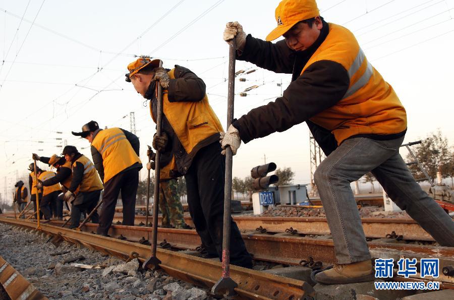 郑州铁路局新乡桥工段南场线路车间龙泉工区车间工长焦炎君(右一)带头和班组工人一道移除旧轨,更换新轨(12月30日摄)。春节前夕,郑州铁路局新乡桥工段负责维护的千里铁道线上南来北往的运输压力陡然增大,每隔几分钟便有一列满载旅客或货物的列车呼啸而过……在这条中原铁路大动脉上,正是有成百上千的铁路职工的默默奉献,才保障了运输线的顺畅通行。新华社记者 潘旭 摄