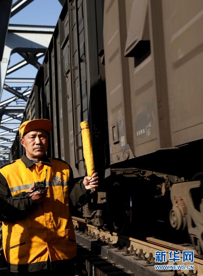 郑州铁路局新乡桥工段东明桥梁车间巡守工陈忠印在长东黄河特大桥上立岗迎车(12月30日摄)。春节前夕,郑州铁路局新乡桥工段负责维护的千里铁道线上南来北往的运输压力陡然增大,每隔几分钟便有一列满载旅客或货物的列车呼啸而过……在这条中原铁路大动脉上,正是有成百上千的铁路职工的默默奉献,才保障了运输线的顺畅通行。新华社记者 潘旭 摄