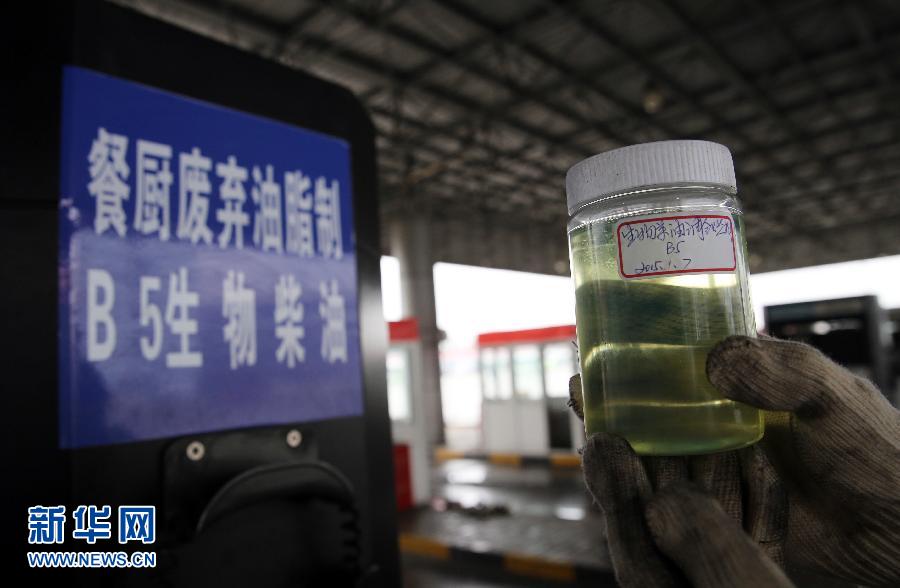 1月14日,巴士一汽的工作人员在展示供公交车使用的餐厨废弃油脂制生物柴油。近日,上海巴士一汽公司利用餐厨废弃油脂提炼生物柴油作为公交车混合燃料的示范项目通过专家评定。据介绍,该公司已有10条线路100辆公交车“喝”上“地沟油”燃料。从2013年9月起,巴士一汽公司就协同上海市食安办、同济大学相关部门,以餐饮垃圾油(地沟油)为原料,通过脂交换工艺制成可代替石化柴油的再生性柴油燃料。经测试,使用“地沟油”燃料的公交营运车辆动力基本不减,颗粒物排放降低近一成。新华社记者 裴鑫摄
