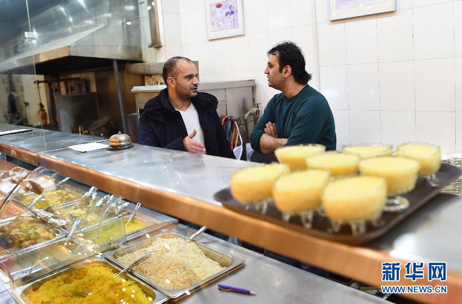 1月13日,穆罕奈德(左)与“花餐厅”员工交谈。在阿拉伯商人云集的浙江省义乌市,约旦商人穆罕奈德开了一家地道的阿拉伯餐馆——“花餐厅”。他把原汁原味的阿拉伯饮食文化带到义乌,收获了事业的成功,并同中国姑娘刘芳喜结连理,把根扎在了中国。穆罕奈德今年37岁,在义乌外商圈知名度颇高。2000年,穆罕奈德来中国,在广州一家阿拉伯餐厅打工,后与来自安徽的穆斯林女孩刘芳相识相恋结婚。2002年,穆罕奈德随叔叔到义乌,由叔叔开设了当地最早的一家阿拉伯餐馆,之后,穆罕奈德夫妇接手了这家餐厅,并将餐厅改名为“花”,寓意幸福之花、和平之花。在义乌10多年,穆罕奈德除了开餐馆,还创办了自己的贸易公司,并和妻子育有两个儿子,一家四口的日子过得有滋有味。作为全球知名国际商贸城市,义乌与阿拉伯国家地区的贸易频繁。据义乌外事与侨务办公室统计,截至2014年年底,常住义乌的外籍商人约15000人,其中像穆罕奈德这样的阿拉伯客商约5000人。新华社记者韩传号摄