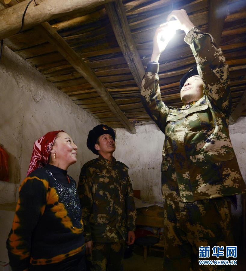 喀拉布拉克边防派出所官兵帮助阿翁库村牧民对谢布比·朱马萨依接通照明电(1月13日摄)。喀拉布拉克乡阿翁库村位于新疆克孜勒苏柯尔克孜自治州阿合奇县高寒山区,距县城160多公里,海拔3000多米且交通不便,自然条件艰苦,未开通长明电。2014年10月,喀拉布拉克乡边防派出所为该乡争取到了706套太阳能发电设备。截至目前,在边防官兵和当地工作人员配合下,这些设备已全部安装到位,并投入使用,极大改善了乡边远村队牧民用电状况。新华社发(刘丈国 摄)
