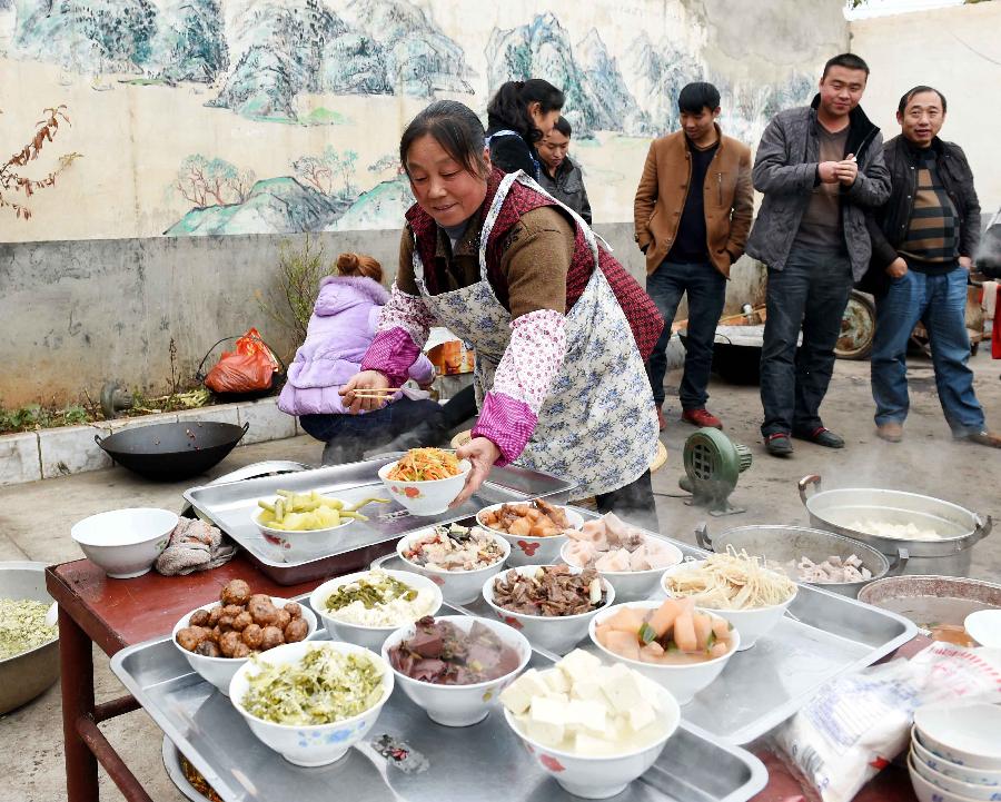 当日,云南省宣威市龙场镇得所村的杨怀珍家杀了三头猪,邀请了几十名亲朋好友来吃“杀猪饭”,亲友相聚,其乐融融。云南的部分地区,尤其是农村,每年的春节前都流行吃“杀猪饭”。到了寒冬腊月的时候,一般有条件的人家就要准备杀猪过年了。辛苦忙碌了一年,杀猪的那天,主人都要大摆宴席,邀请四里八乡的亲朋好友前来,其热闹气氛好比过年。许多农家往往要杀几头猪,当天的新鲜猪肉除了请客人品尝,其余的会做成腊肉、火腿或香肠等,留着过年或开春以后慢慢吃。新华社记者 杨宗友 摄