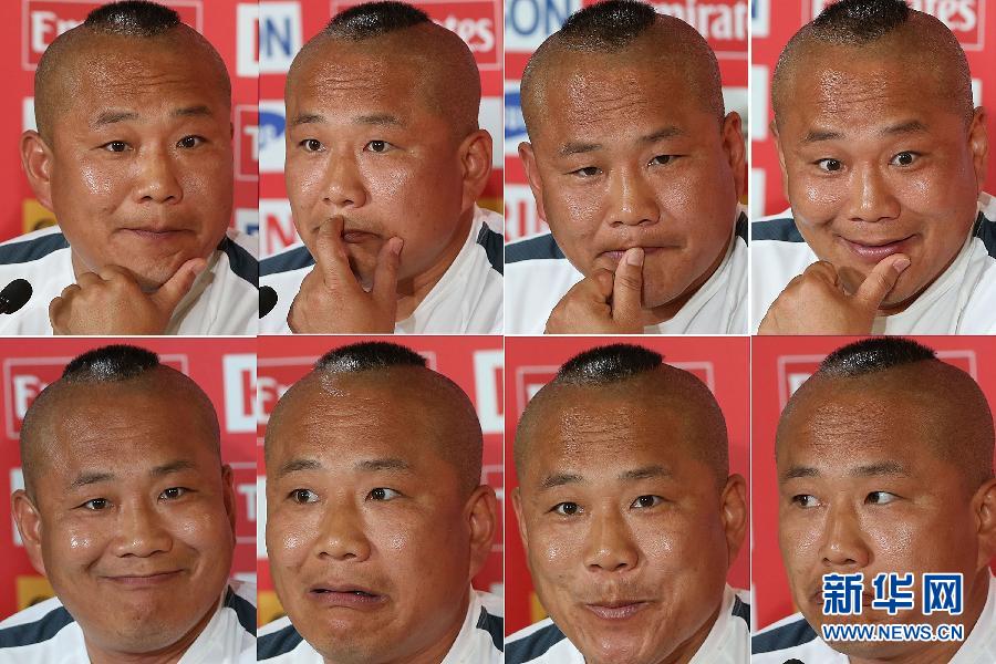 2015年亚洲杯足球赛目前正在澳大利亚举行,中国队主教练佩兰的翻译赵旭东在工作时因表情丰富、有趣,一时间成为媒体追逐的焦点,更被球迷亲昵地称为国足“翻译哥”。这是中国队在澳大利亚布里斯班举行的赛前新闻发布会上,赵旭东各种有趣的表情(拼版照片、1月13日摄)。 新华社记者曹灿摄