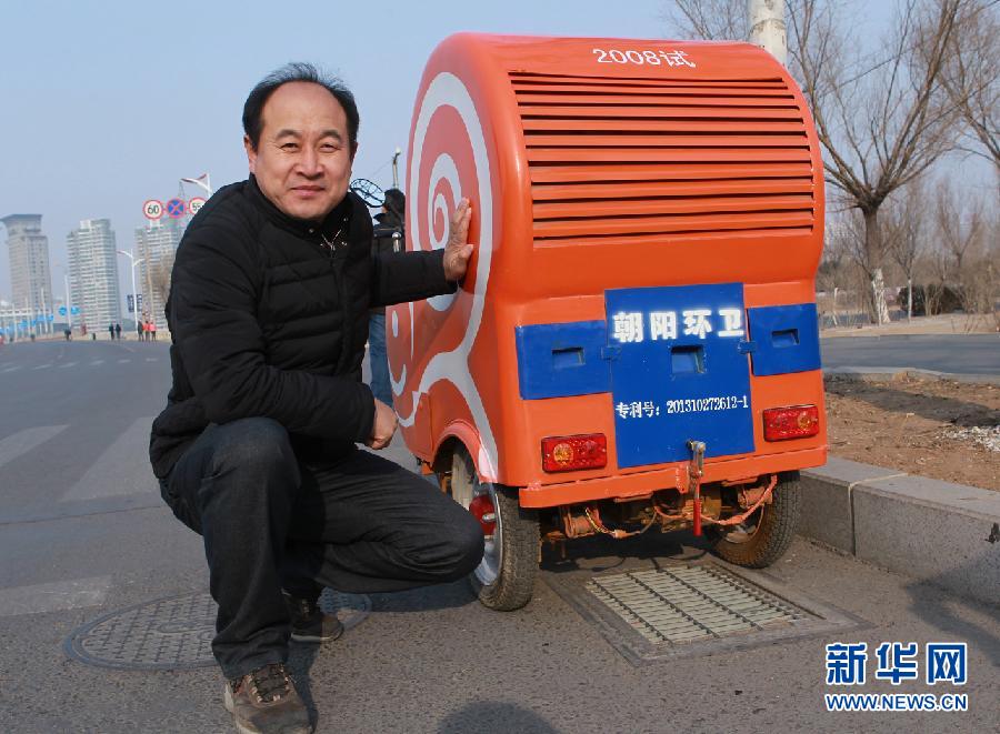 1月14日,劳模夏志国展示他研发的“自吸式垃圾分解机”。当日,首批30台“自吸式垃圾分解机”在辽宁省朝阳市正式投入使用。该垃圾清扫分解机是在环卫清扫一线工作多年的劳模夏志国历经5年研发而成。该清扫机安装了锂电池,提升了清扫保洁效率,减轻了环卫工人工作强度,以吸代扫,减少了二次扬尘。新华社发(仇一军 摄)