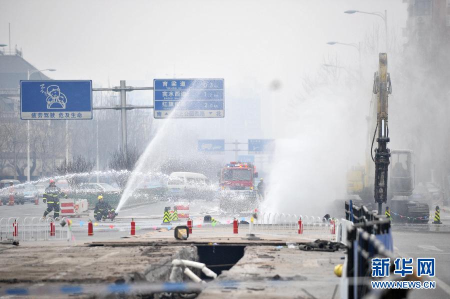 1月14日,消防队员向事故处喷水。当日上午12点左右,在天津市迎水道与水上西路交叉路口,因道路施工破坏了燃气管道发生燃气泄漏,空气中弥漫着刺鼻气味,四周道路已封闭。目前,泄漏已经停止,抢修仍在进行中,没有人员伤亡。新华社记者 张晨霖 摄