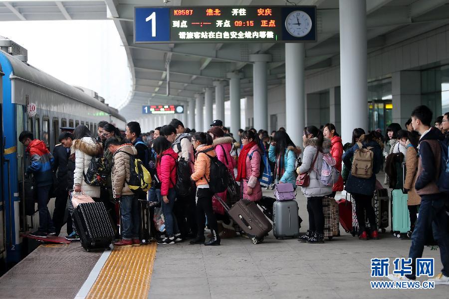 1月14日,大学生在安徽淮北火车站站台排队上车。随着寒假的到来,安徽淮北火车站迎来寒假大学生客流小高峰。 新华社发(万善朝 摄)