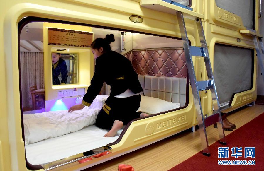 1月15日,工作人员在舱房内整理床铺。近日,起源于日本的“胶囊”旅馆在河南郑州悄然兴起。床铺、网络电视、无线网络,两平方米左右的舱房内一应俱全,前来住宿的客人以学生、旅行者及求职的年轻人居多。新华社记者 李安摄