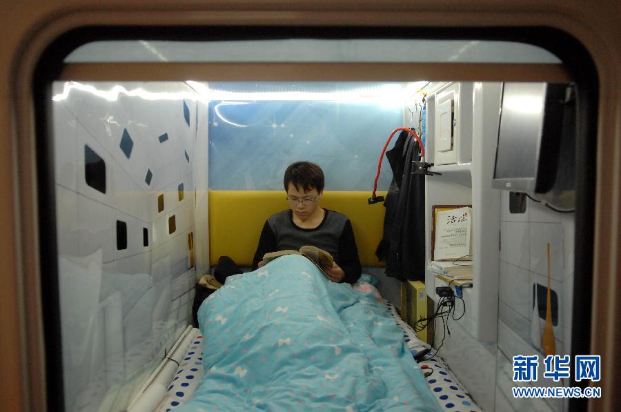 近日,起源于日本的“胶囊”旅馆在河南郑州悄然兴起。床铺、网络电视、无线网络,两平方米左右的舱房内一应俱全,前来住宿的客人以学生、旅行者及求职的年轻人居多。(新华社发 冯大鹏摄)