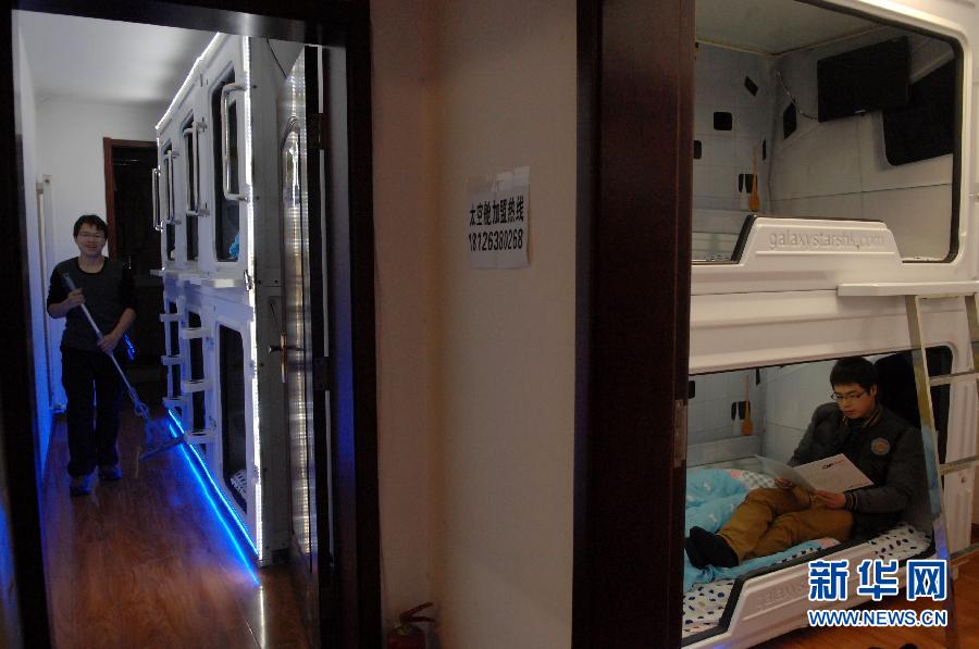 近日,起源于日本的“胶囊”旅馆在河南郑州悄然兴起。床铺、网络电视、无线网络,两平方米左右的舱房内一应俱全,前来住宿的客人以学生、旅行者及求职的年轻人居多。(新华社发 冯大鹏摄)