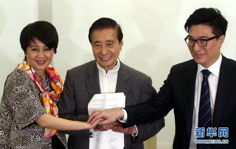 1月15日,香港恒基兆业地产主席李兆基(中)在香港举行的签约仪式上。当日,香港恒基兆业地产主席李兆基与香港慈善机构保良局举行签约仪式,宣布其向保良局捐出家族拥有的位于新界元朗区的土地,用于兴建香港最大的青年宿舍,并将以市场价一半的租金租给约1600名青年人居住。新华社记者吕小炜摄