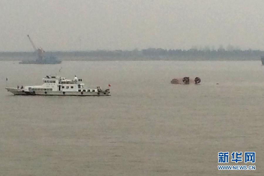 1月15日,事故船只在长江福北水道航标FB14浮上游约500米处只露出推进器部分,海事部门正在施救(手机拍摄)。据江苏省海事局最新通报,15日下午,在长江福北水道发生一艘试航拖轮自沉事故,有多名人员落水。据被救船员介绍,船舶沉没前,船上至少还有十几人。新华社发