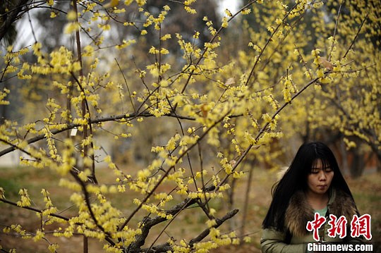 1月15日,淡黄色的蜡梅花星星点点的点缀在蜡梅树上,引得游人纷纷驻足留影。中新社发 张畅 摄