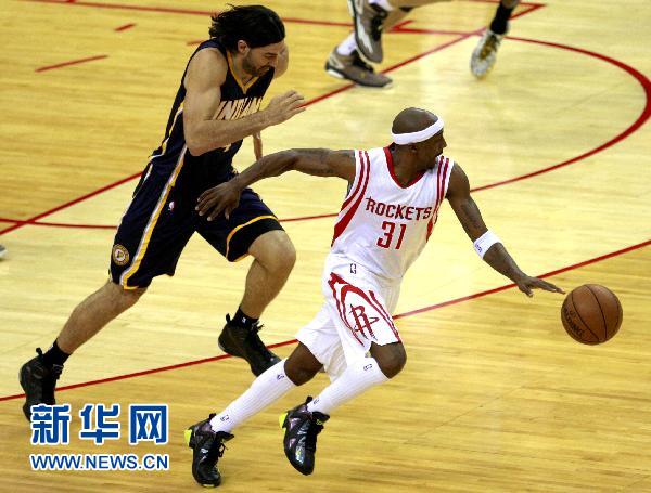 1月19日,步行者队球员斯科拉(左)在比赛中防守火箭队球员杰森·特里。当日,在2014-2015赛季NBA常规赛中,休斯敦火箭队主场迎战印第安纳步行者队。 新华社发(宋穹摄)
