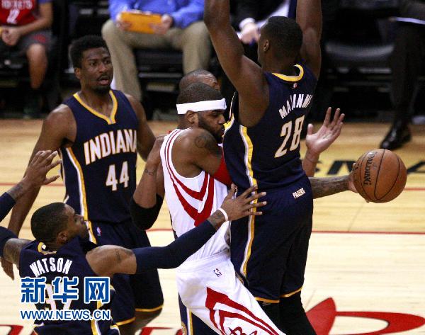 1月19日,火箭队球员约什·史密斯(右二)在比赛中突破分球。当日,在2014-2015赛季NBA常规赛中,休斯敦火箭队主场迎战印第安纳步行者队。 新华社发(宋穹摄)