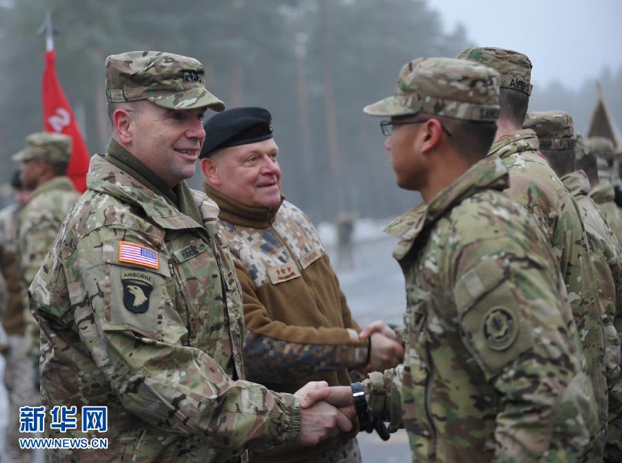 1月19日,在拉脱维亚阿达日军事基地,美国驻欧洲陆军司令部指挥官弗雷德里克·本·霍奇斯中将(左一)和拉脱维亚武装部队司令格劳贝(左二)欢迎美军士兵。当日,驻拉脱维亚美军在阿达日军事基地举行换防仪式,拉脱维亚国防部长韦约尼斯、武装部队司令格劳贝和美国驻欧洲陆军司令部指挥官弗雷德里克·本·霍奇斯中将出席了仪式。去年4月,在乌克兰危机发生后,为了加强北约在波罗的海地区的军事力量,美国向拉脱维亚和其他波罗的海国家派驻了部队。此次换防是美军在拉驻扎以来的第三次。新换防部队由美国第二骑兵团的170名士兵组成,在拉期间他们将执行“大西洋决心”行动任务,驻扎期将于今年3月底结束。新华社记者郭群摄