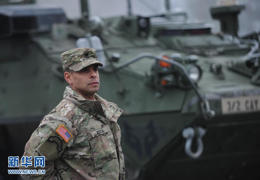 1月19日,在拉脱维亚阿达日军事基地,美军士兵参加换防仪式。当日,驻拉脱维亚美军在阿达日军事基地举行换防仪式,拉脱维亚国防部长韦约尼斯、武装部队司令格劳贝和美国驻欧洲陆军司令部指挥官弗雷德里克·本·霍奇斯中将出席了仪式。去年4月,在乌克兰危机发生后,为了加强北约在波罗的海地区的军事力量,美国向拉脱维亚和其他波罗的海国家派驻了部队。此次换防是美军在拉驻扎以来的第三次。新换防部队由美国第二骑兵团的170名士兵组成,在拉期间他们将执行“大西洋决心”行动任务,驻扎期将于今年3月底结束。新华社记者郭群摄