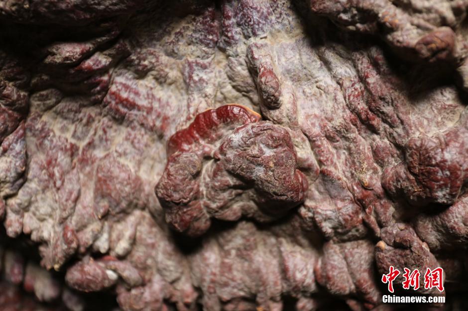 1月19日,记者在郑州古道石刻博物馆看到,两棵伞状的巨型灵芝分别用绳子吊在屋内,两棵灵芝的直径达到1.2米和1.5米,重达10公斤和12公斤,其中的一棵灵芝上新生长了许多小灵芝。博物馆郭馆长介绍,这两棵灵芝原生长在越南的原始森林中,采摘后按其生长纹路测算,其生长年份均超过200年,如此巨大的百年以上的野生灵芝十分罕见,堪称“稀世之宝”。杨正华 摄