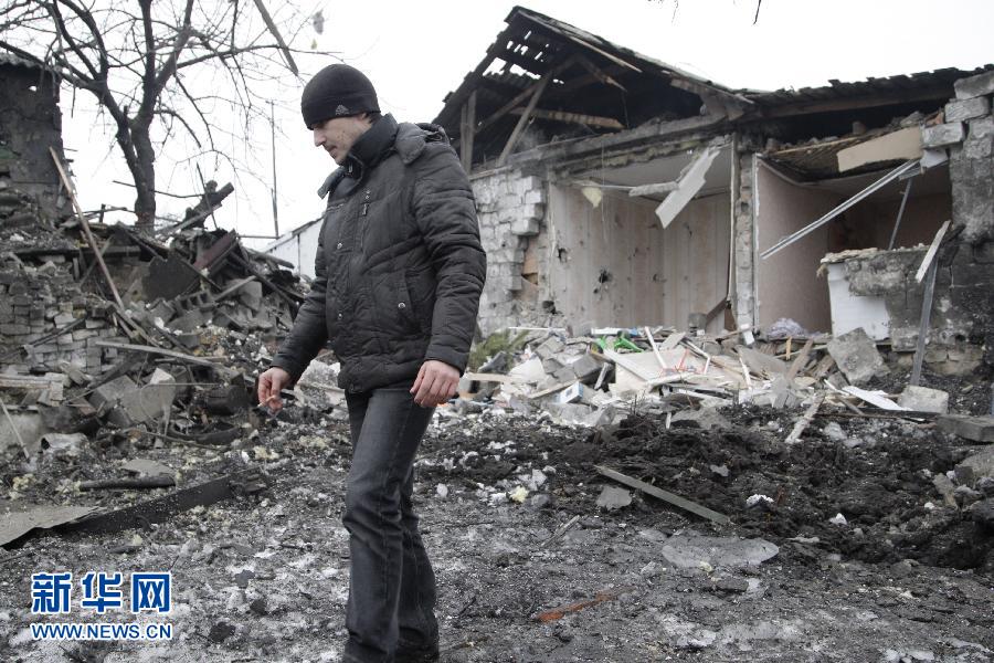 1月19日,在乌克兰东部顿涅茨克地区,一名男子站在一处遭到炮击的房屋前。目前乌克兰政府军和民间武装围绕顿涅茨克机场的争夺战日趋激烈。顿涅茨克机场在乌克兰东部交战地区具有重要战略地位。乌民间武装去年4月占领该机场,乌军在7月底将其夺回。此后民间武装对驻守机场的乌军不断发动攻击,但机场一直被乌军控制。近日机场地区爆发空前激烈的战斗,交战双方动用了火箭炮和坦克等重武器。民间武装16日宣布攻占机场,但乌军方否认这一消息。新华社发(叶尔莫琴科摄)