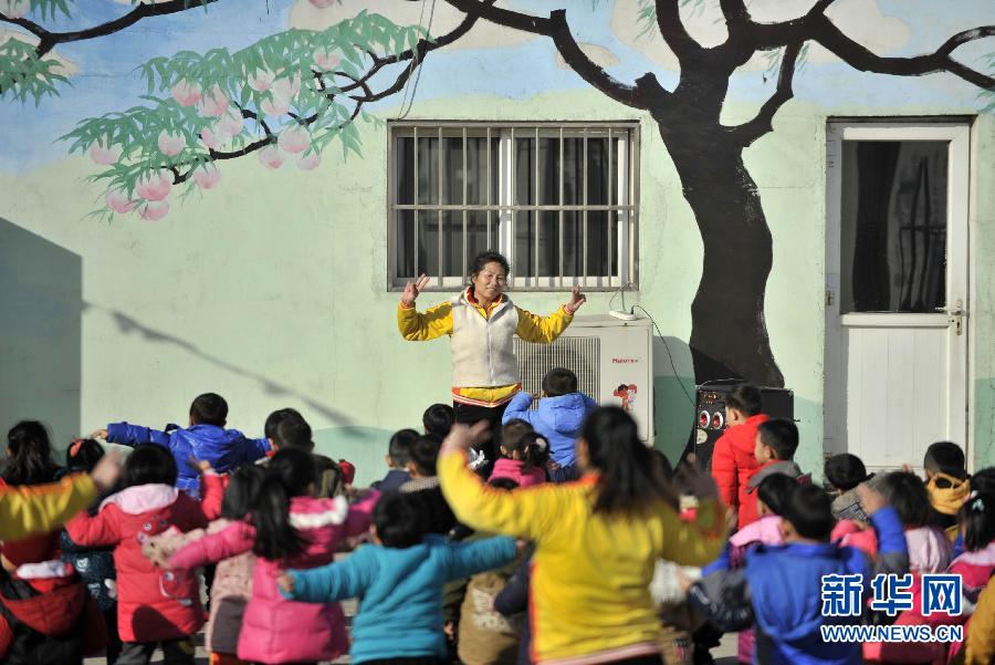 1月19日,童星幼儿园的孩子们在老师的带领下锻炼身体。位于天津市滨海新区塘沽梁子村的童星幼儿园是一所2010年建立的民办幼儿园,近期被天津市教委评为“阳光乐园”,全园100多名孩子中有近70%左右都是外来务工人员子女,孩子们在异乡的幼儿园内享受正规的教育。据了解,滨海新区是天津市外来务工人口数量最多的区域,子女入园难长期困扰外来务工人员。为此,天津市教委从2010年开始对招收外来务工人员子女为主的幼儿园实施三年行动计划,对30所挂牌为“阳光乐园”的幼儿园提供资助,为孩子们接受学前教育提供便利。新华社记者岳月伟摄