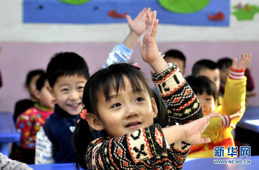 1月19日,孩子们在教室举手回答问题。位于天津市滨海新区塘沽梁子村的童星幼儿园是一所2010年建立的民办幼儿园,近期被天津市教委评为“阳光乐园”,全园100多名孩子中有近70%左右都是外来务工人员子女,孩子们在异乡的幼儿园内享受正规的教育。据了解,滨海新区是天津市外来务工人口数量最多的区域,子女入园难长期困扰外来务工人员。为此,天津市教委从2010年开始对招收外来务工人员子女为主的幼儿园实施三年行动计划,对30所挂牌为“阳光乐园”的幼儿园提供资助,为孩子们接受学前教育提供便利。新华社记者岳月伟摄