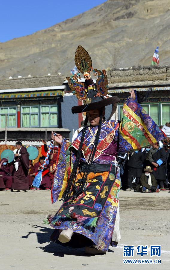 1月19日,喇嘛在表演宗教舞蹈。当日,西藏萨迦寺举行一年一度的“堆庆”宗教神舞表演,吸引了周边数万名农牧民群众前来观看。每年藏历11月29日,萨迦寺都会举行神奇独特的宗教神舞表演,“堆庆”神舞表演已有500多年历史,由僧俗共同表演,表演者背上50多公斤重的巨幅护法神、神牛等面具,场面十分壮观。新华社记者 刘东君 摄