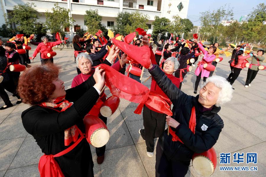 1月19日,江西省峡江县由老年妇女自发组织的“婆婆”腰鼓队加紧排练,为春节期间给乡亲们演出做准备。 新华社发(曾双全 摄)