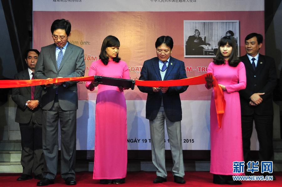 1月19日,在越南首都河内,中国驻越南大使洪小勇(前左一)和越南文化体育旅游部副部长王维边(前右二)在中越建交65周年图片展上剪彩。当日,中国驻越南大使馆和越南胡志明博物馆在越南首都河内联合举办“纪念中越建交65周年图片展”,展出了有关中越交往的120多幅图片和许多实物。新华社记者章建华摄