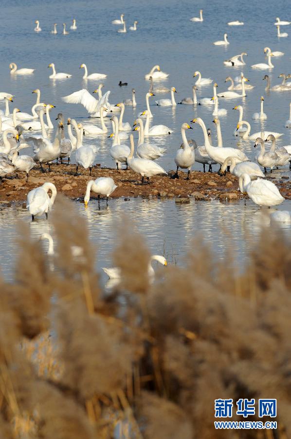 1月17日,白天鹅在三门峡黄河湿地栖息。