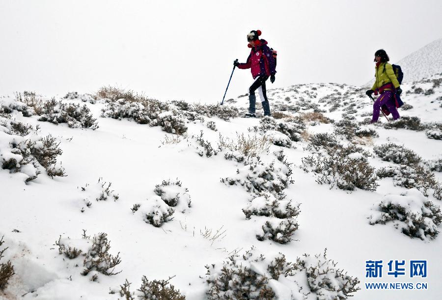 1月17日,户外运动爱好者行进在穿越甘肃张掖平山湖丹霞石林大峡谷的途中。当日,甘肃张掖和临近市区的161名户外运动爱好者在张掖号角户外运动俱乐部的组织下,顶风冒雪行进18公里,穿越甘肃张掖平山湖丹霞石林大峡谷,徒步健身。新华社发(王将 摄)