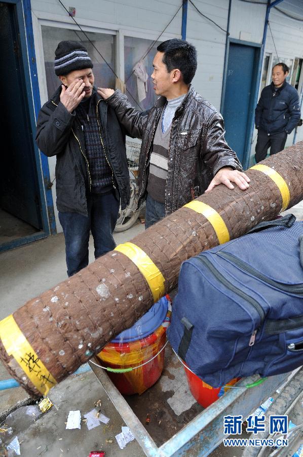 1月12日,工人蒋兴华(左)泪别已经拿到工钱准备返乡的工友。新华社1月1日播发《他们,在讨薪囧途上迎来新年》稿件后,引起各界关注,1月9日、10日,坚守在宁夏银川市鼎辉时代城二期项目工地上讨薪2个多月的部分工人领到了属于自己的报酬。 1月12日,记者来到工地上回访时发现,一些领到工钱的工人已经陆续返乡,仍有近10名还没有领取或没有领完工钱的工人在工地上坚守。由于缺少暖气和取暖设备,工地上和工棚内异常寒冷,几位妇女甚至卧病在床。新华社记者彭昭之摄