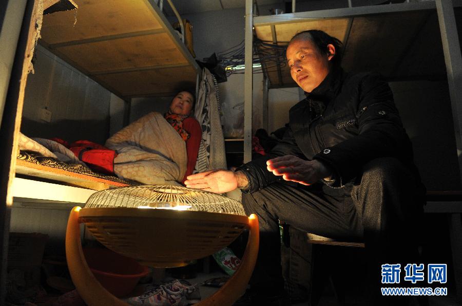 1月12日,赵碧勇和陈华英夫妻正在工棚里取暖。他们领到了3万多元工钱,但是还有2万多元没有拿到手。新华社1月1日播发《他们,在讨薪囧途上迎来新年》稿件后,引起各界关注,1月9日、10日,坚守在宁夏银川市鼎辉时代城二期项目工地上讨薪2个多月的部分工人领到了属于自己的报酬。 1月12日,记者来到工地上回访时发现,一些领到工钱的工人已经陆续返乡,仍有近10名还没有领取或没有领完工钱的工人在工地上坚守。由于缺少暖气和取暖设备,工地上和工棚内异常寒冷,几位妇女甚至卧病在床。新华社记者彭昭之摄