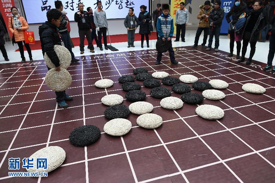 1月17日,参赛小选手在巨型棋盘上进行趣味五子棋比赛。当日,“宁港杯”银川市首届五子棋挑战赛在宁夏银川市开赛。比赛分为儿童组、青少组、成人组三个组别进行积分循环赛,最后决出五子棋王。趣味比赛中,一张约10米见方的巨型五子棋盘及100枚大型棋子亮相比赛现场,吸引众多选手,在巨型棋盘上一展身手。新华社记者王鹏摄