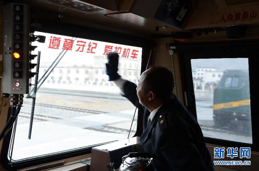1月16日早晨,司机龚贞军和他的徒弟从西藏拉萨出发,驾驶列车驶向西藏第二大城市日喀则,下午返回拉萨,一天的高原生活就这样度过。龚贞军今年41岁,当火车司机已经有15年。青藏铁路开通前,龚贞军参与高原火车试车;2006年青藏铁路开通时,龚贞军成为第一批火车司机。从那时起,他与高原铁路结缘,每年从青海格尔木至拉萨往返120多次,对昆仑山隧道、藏北无人区、唐古拉山等重要路段了如指掌。龚贞军说,高原铁路有冻土等不可预知的情况,根据四季温度和天气,车速不同。因此,他在工作中不断总结、写日记,以备年轻人使用。 新华社记者觉果 摄