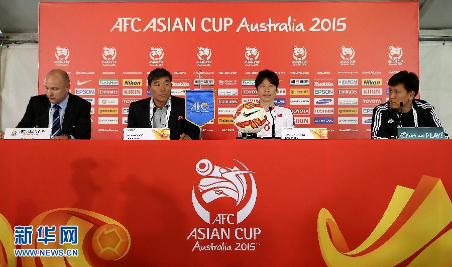 1月17日,朝鲜队主教练赵侗旭(左二)与球员梁勇基(右二)在发布会上。当日,朝鲜队在澳大利亚堪培拉举行赛前新闻发布会。朝鲜队将在1月18日亚洲杯小组赛中对阵中国队。 新华社记者曹灿摄
