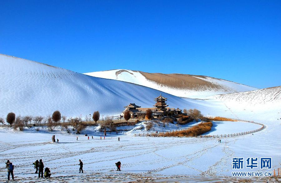 1月17日,游客在甘肃省敦煌市鸣沙山月牙泉景区欣赏大漠雪景。 1月16日,甘肃省敦煌市迎来了2015年首场降雪。 新华社发(张晓亮 摄)