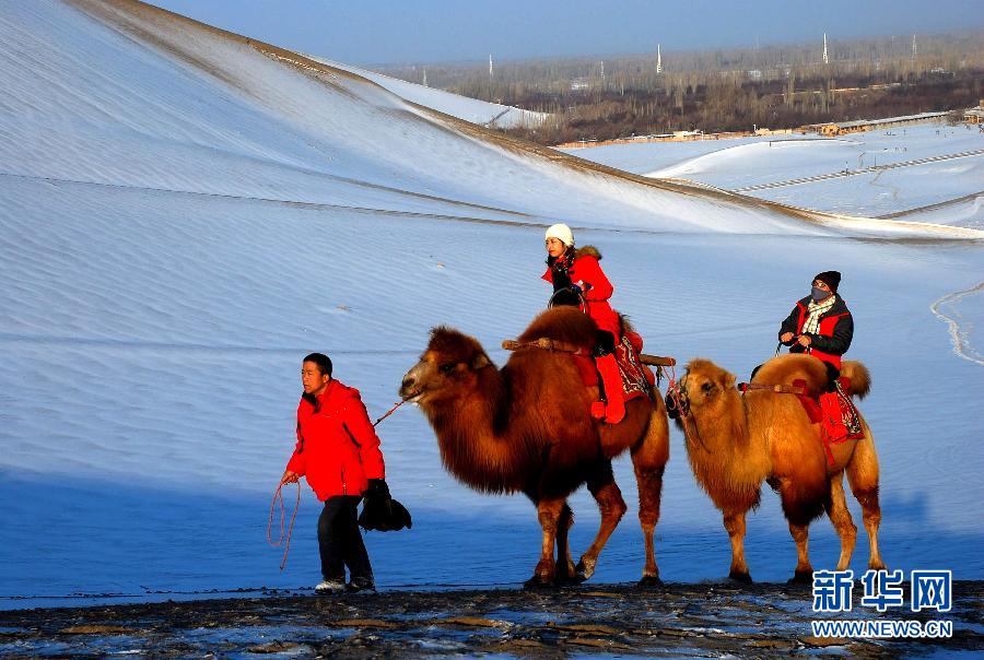 1月17日,游客在甘肃省敦煌市鸣沙山月牙泉景区骑骆驼。 1月16日,甘肃省敦煌市迎来了2015年首场降雪。 新华社发(张晓亮 摄)