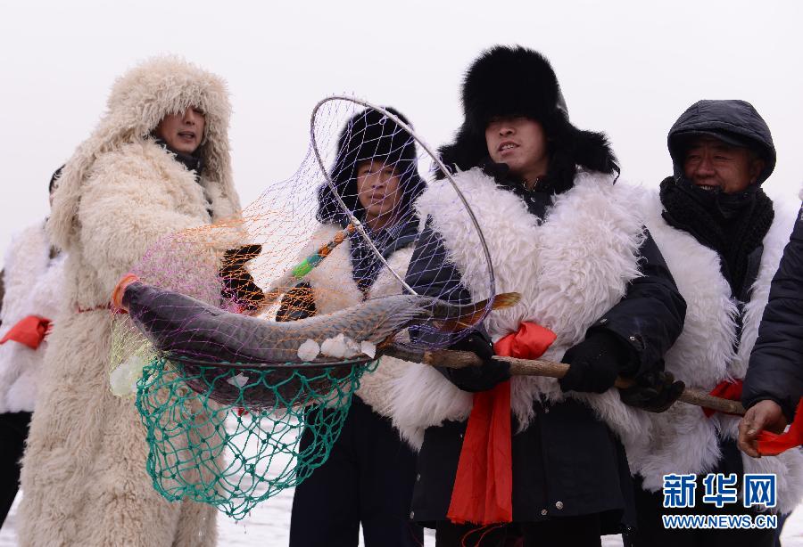 1月18日,渔民在第三届辽宁康平卧龙湖大辽文化冬捕节上展示捕获的鲜鱼。当日,为期7天的第三届辽宁康平卧龙湖大辽文化冬捕节在沈阳市康平县卧龙湖开幕,期间举行辽代祭祖仪式、祭湖醒网仪式、品尝鱼头汤、看雪雕等丰富多彩的系列活动。卧龙湖位于沈阳北部,面积127.5平方公里,是辽宁省最大的平原淡水湖。当地的大辽文化冬捕节已经连续举办两届,辽代元素贯穿整个冬捕活动,成为辽宁北部地区独具特色的冬季旅游品牌。新华社发(燕东亮 摄)