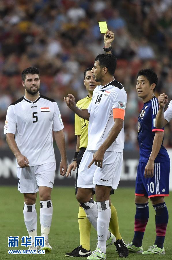 1月16日,伊拉克队球员萨拉姆(中)在比赛中被裁判出示黄牌警告。当日,在澳大利亚布里斯班举行的亚洲杯足球赛D组比赛中,日本队以1比0战胜伊拉克队。 新华社记者秦晴摄