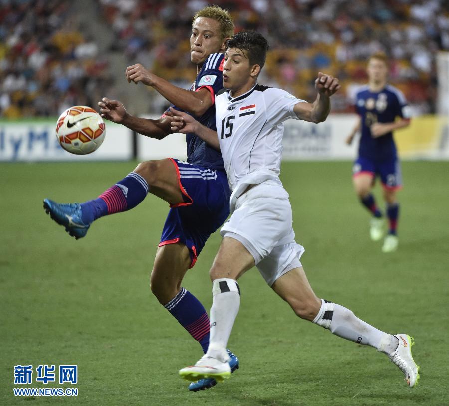 1月16日,日本队球员本田圭佑(左)和伊拉克队球员萨斯梅尔在比赛中拼抢。当日,在澳大利亚布里斯班举行的亚洲杯足球赛D组比赛中,日本队以1比0战胜伊拉克队。 新华社记者秦晴摄