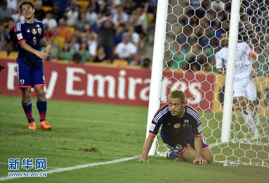 1月16日,日本队球员本田圭佑(右)在比赛中错失进球良机。当日,在澳大利亚布里斯班举行的亚洲杯足球赛D组比赛中,日本队以1比0战胜伊拉克队。 新华社记者秦晴摄