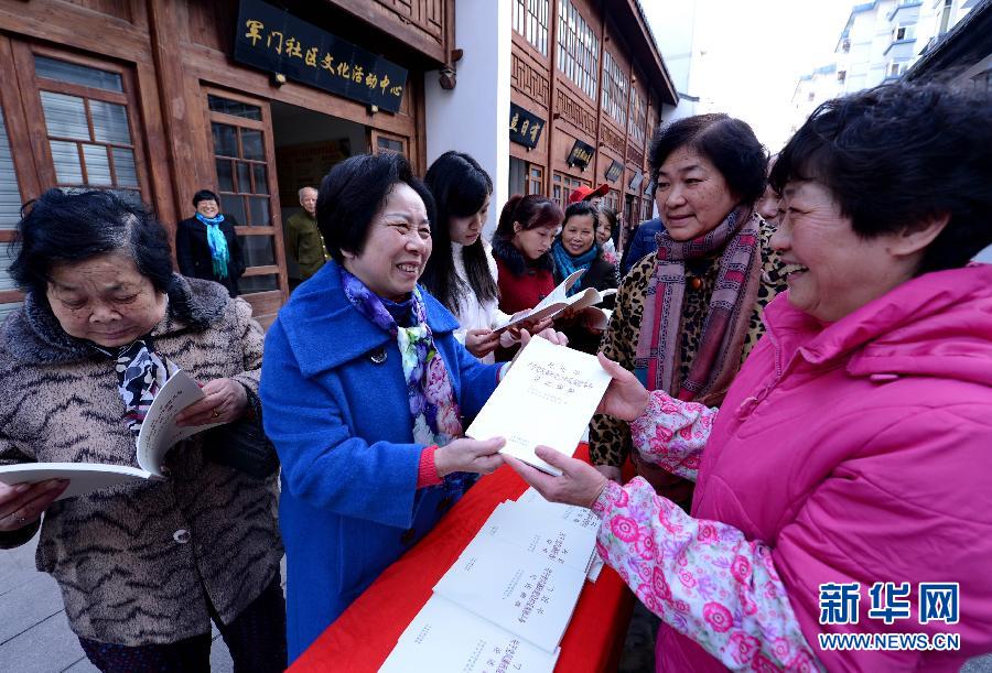 1月16日,鼓楼区军门社区党委书记林丹(左二)向社区居民赠阅《习近平关于党风廉政建设和反腐败斗争论述摘编》一书。