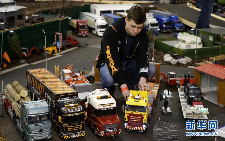 1月17日,在英国伦敦亚历山大宫,参展人员码放遥控卡车。