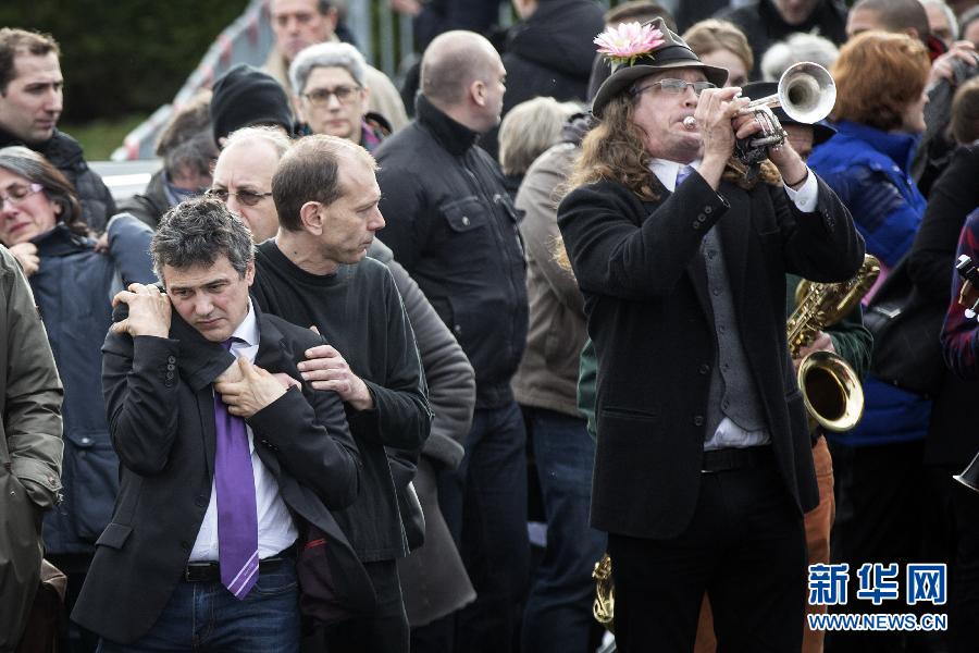 1月16日,在法国巴黎郊区的蓬图瓦兹市,民众出席《沙尔利周刊》恐怖袭击中丧生的主编斯特凡纳·沙博尼耶的葬礼。 武装分子1月7日中午袭击了《沙尔利周刊》巴黎总部,造成包括该刊主编在内12人死亡、11人受伤。 新华社发(何塞·罗德里格摄)