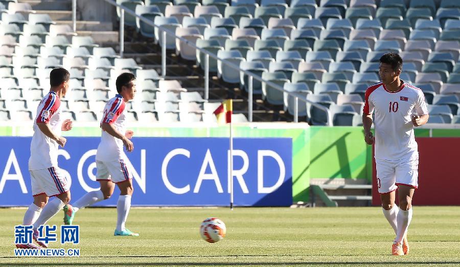 1月17日,朝鲜队球员朴光龙(左四)与队友在训练前热身。当日,朝鲜队在澳大利亚堪培拉体育场进行踩场训练,备战18日亚洲杯小组赛对阵中国队的比赛。 新华社记者曹灿摄
