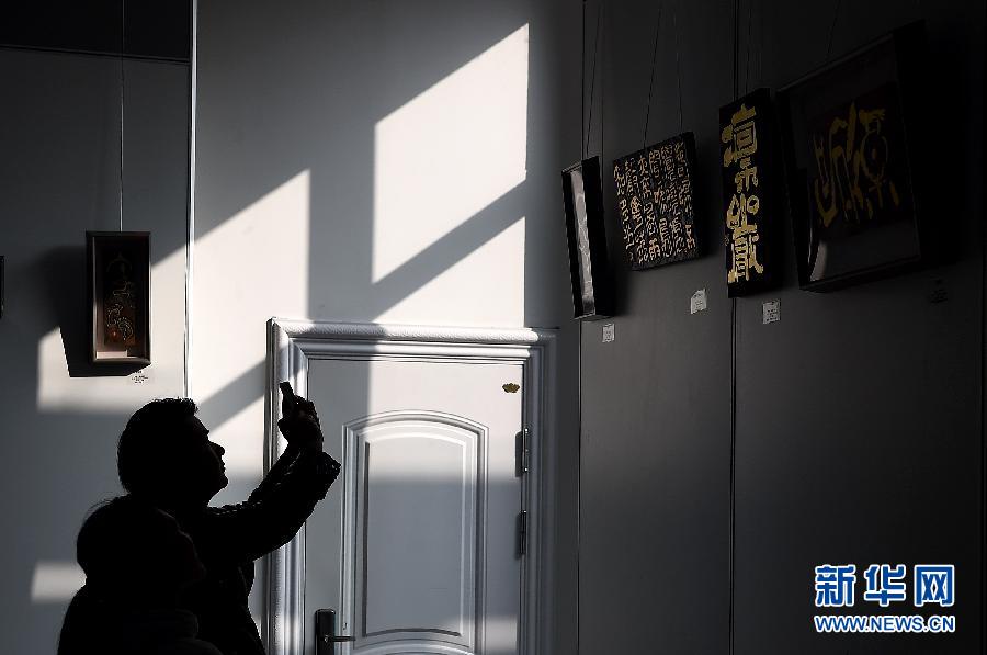 1月20日,在海南省图书馆,观众用手机拍摄刻字作品。当日,日本刻字展在位于海南省海口市的海南省图书馆举行。展览展出日本千岁会、大鹏会、青云会等刻字团体的200幅刻字艺术作品。 新华社记者郭程 摄